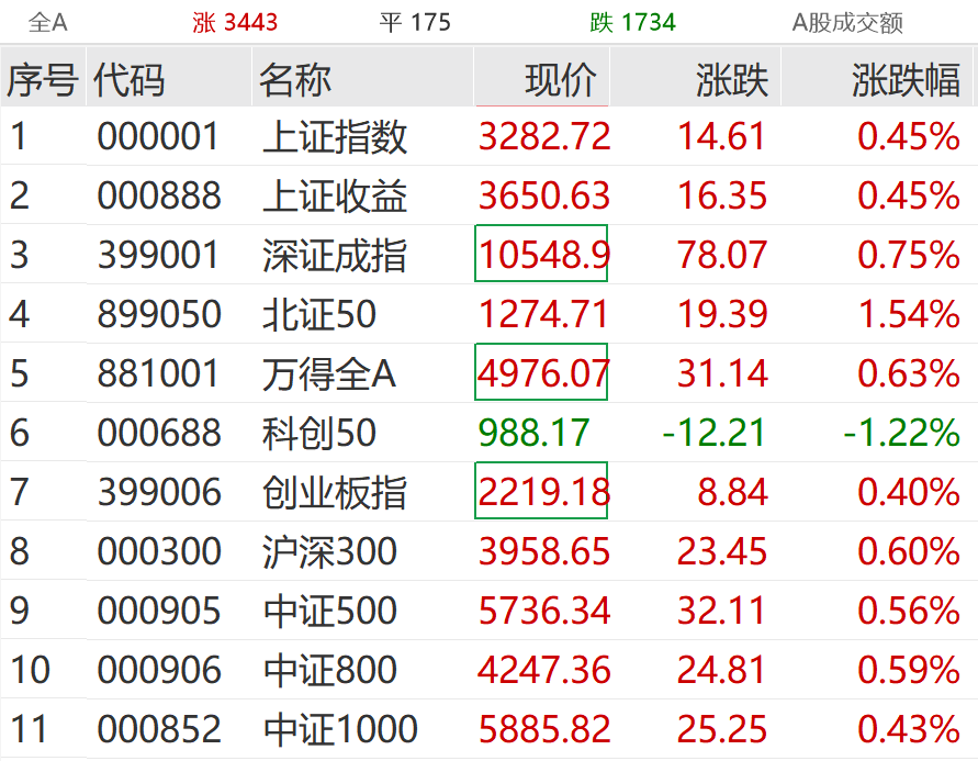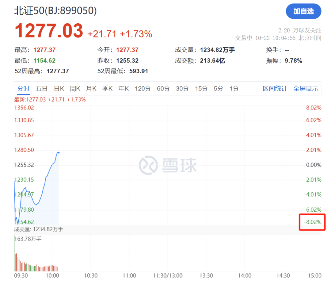 10月22日,A股三大指数小幅低开:上证指数报3263.82点,跌幅为0.13%;深证成指跌0.11%,创业板指跌0.22%。上午市场窄幅震荡,北证50盘初跌超8%。截至发稿,A股三大指数均已翻红回升。