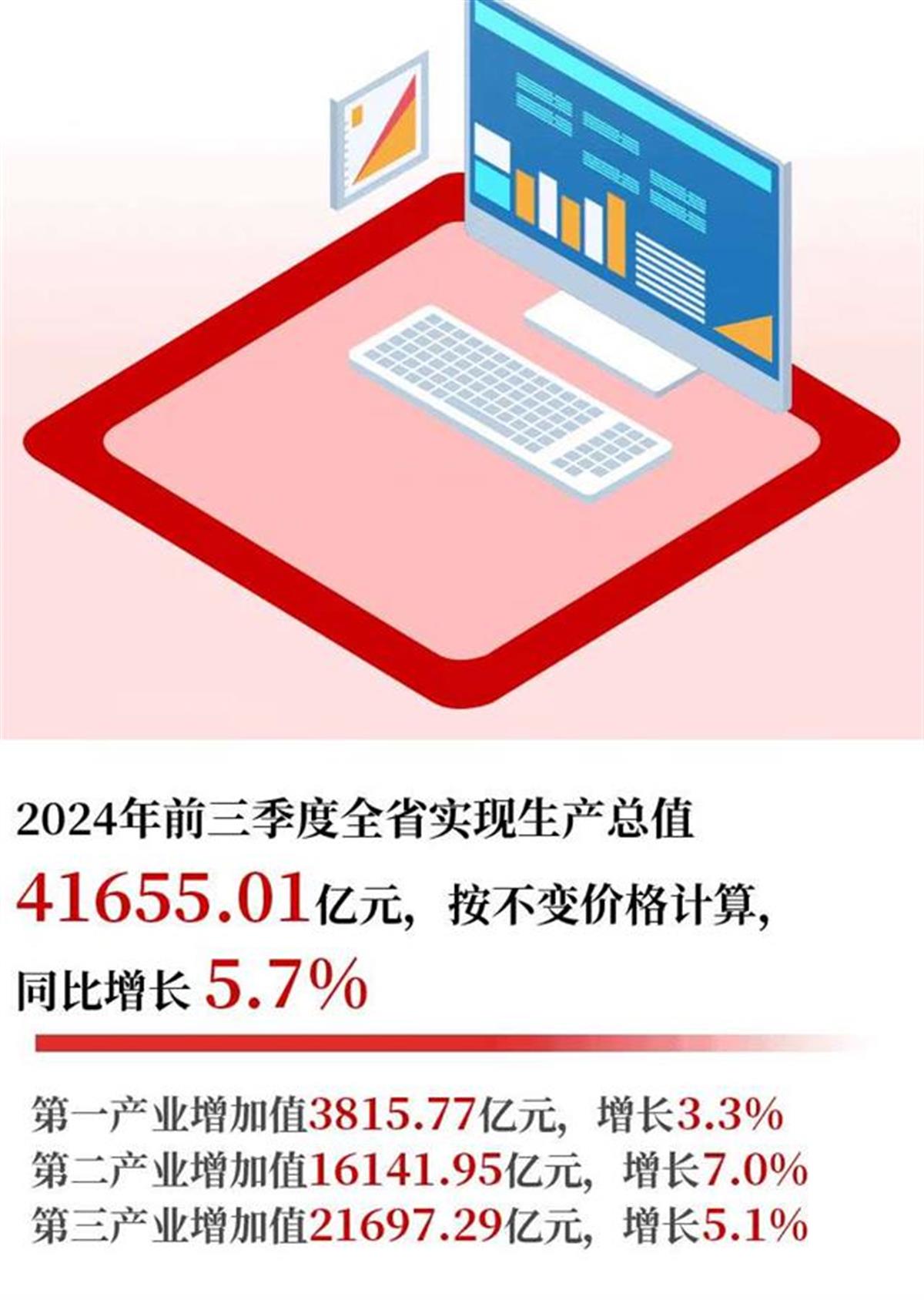 极目新闻记者在新闻发布会上获悉,2024年前三季度,全省农林牧渔业增加值同比增长3.8%,比上半年加快0.4个百分点,高于全国0.2个百分点。规上工业增加值增长8.1%,比上半年加快0.2个百分点,高于全国2.3个百分点。41个大类行业中30个实现增长。1-8月,规上服务业营业收入增长8.7%,高于全国1.0个百分点。