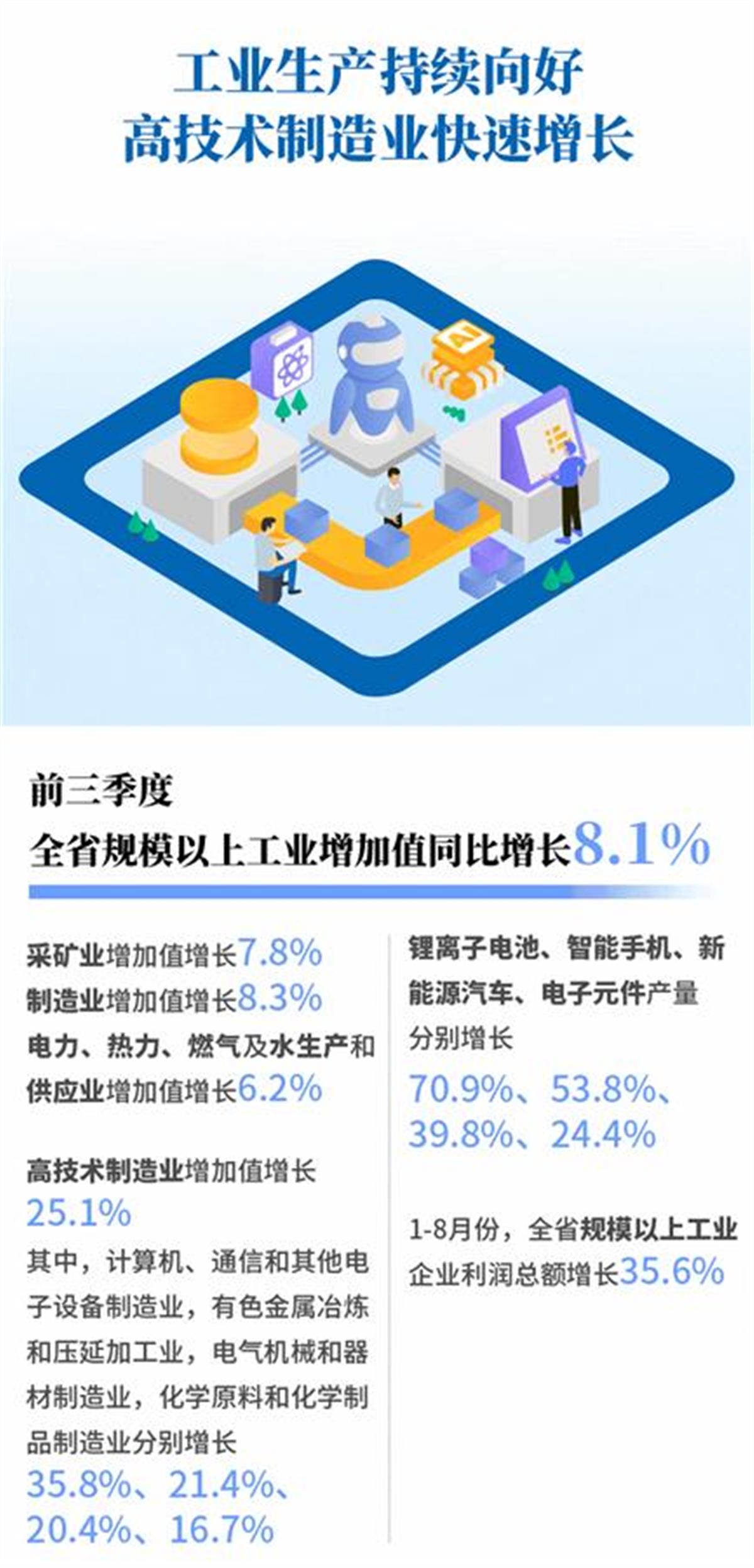 值得关注的是,前三季度,全省新兴产业加快成势。高技术制造业增加值增长25.1%,比上半年加快0.5个百分点,高于全国16.0个百分点,对全省规上工业增长贡献率达35.8%,比上年同期提升25.6个百分点。锂离子电池、智能手机、新能源汽车、电子元件、平板电脑产量分别增长70.9%、53.8%、39.8%、24.4%、12.8%。1-8月,规上互联网和相关服务业营业收入增长17.1%,高于全国6.3个百分点。