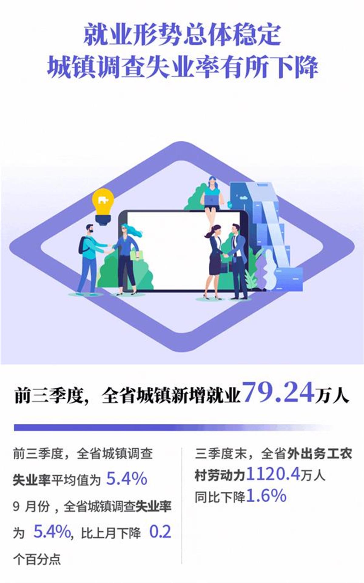 就业是最大的民生。前三季度,全省城镇新增就业79.24万人,城镇调查失业率平均值为5.4%。9月份,全省城镇调查失业率为5.4%,比上月下降0.2个百分点。三季度末,全省外出务工农村劳动力1120.4万人,同比下降1.6%。前三季度,全省全体居民人均可支配收入26636元,同比增长4.9%。从收入来源看,工资性收入、经营净收入、转移净收入分别增长5.7%、5.7%、4.7%,财产净收入下降2.1%。按常住地分,城镇居民人均可支配收入34811元,增长4.2%;农村居民人均可支配收入15087元,增长6.0%。城乡居民人均可支配收入比为2.31,比上年同期缩小0.04。