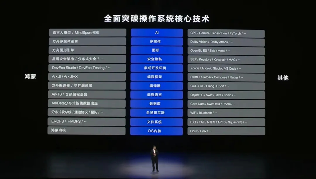 但如今,鸿蒙已经在编程框架、编程语言、编译器、数据库、多媒体、图形、安全隐私、集成开发环境、AI等操作系统核心技术方面实现了全面国产化突破。比如在AI层面华为推出了盘古大模型和MindSpore框架,在编译器方面华为推出了方舟编译器和毕昇编译器,在编程语言上推出了仓颉编程语言等。