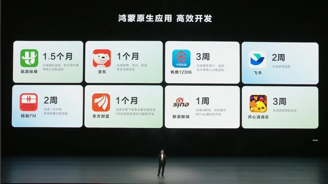 “像航旅纵横,一个半月就完成了值机的选座、电子登机牌等等的核心功能的适配。比如像京东,一个月就完成了购物、支付、配送等全流程的验证,比如像铁路的12306,三周就完成了票务的预订、选座、支付等等核心功能的适配。”余承东表示。