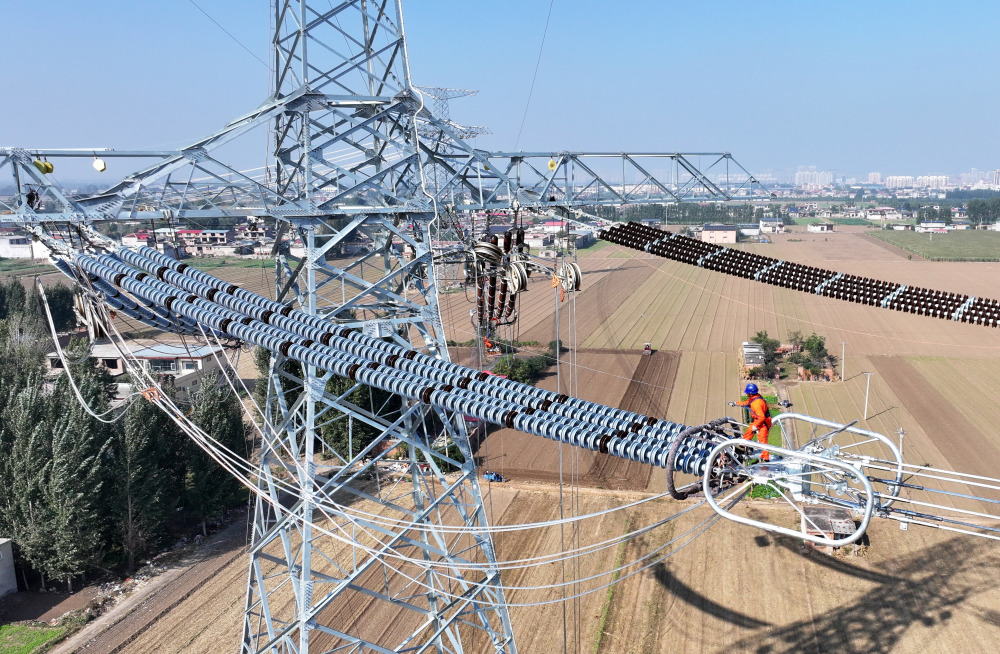 10月23日,工人在河北磁县磁州镇境内的陇东至山东800千伏特高压直流线路工程河北段跨京广铁路建设工地施工(无人机照片)。新华社记者 杨世尧 摄