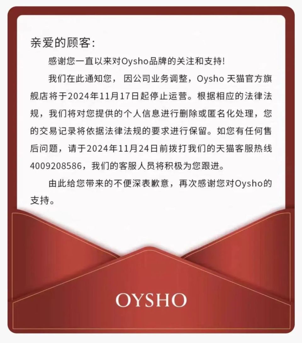 该通告显示,因公司业务调整,Oysho官方旗舰店将于2024年11月17日起停止运营。根据相应的法律法规,公司将对顾客提供的个人信息进行删除或匿名化处理,顾客的交易记录将依据法律法规的要求进行保留。