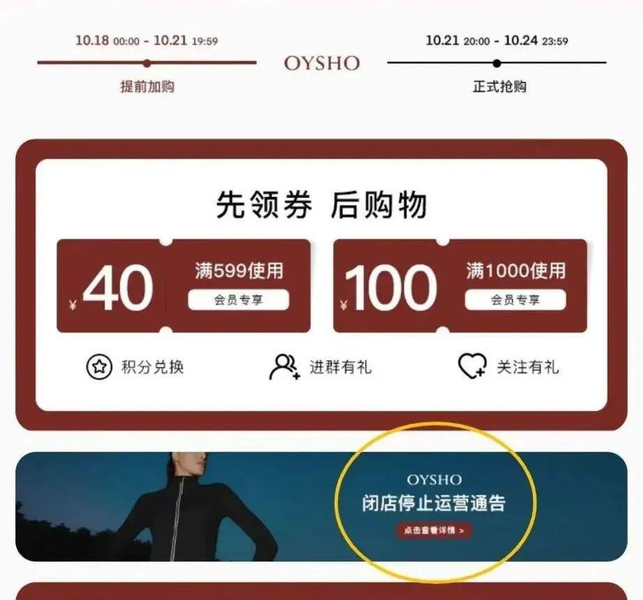 Inditex集团旗下Oysho的旗舰店,近日发布闭店停止运营通告。