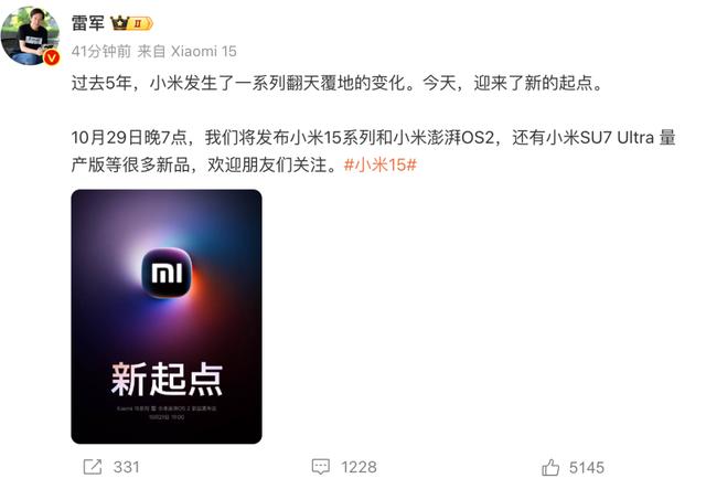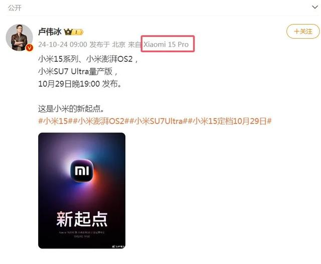 同日,小米集团合伙人、总裁卢伟冰也发布微博称,小米15系列、小米澎湃OS2、小米SU7 Ultra量产版将于10月29日晚7点发布,“这是小米新的起点”。