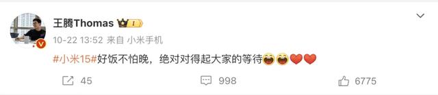 此前,小米15已多次登上热搜,但小米官方迟迟未正式发布新品。针对这一情况,小米公司王腾此前曾在社交媒体上表示:“好饭不怕晚,小米15绝对对得起大家的等待。”