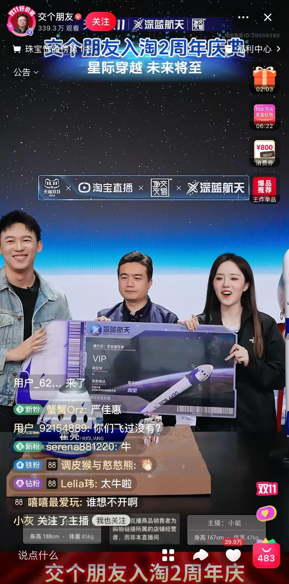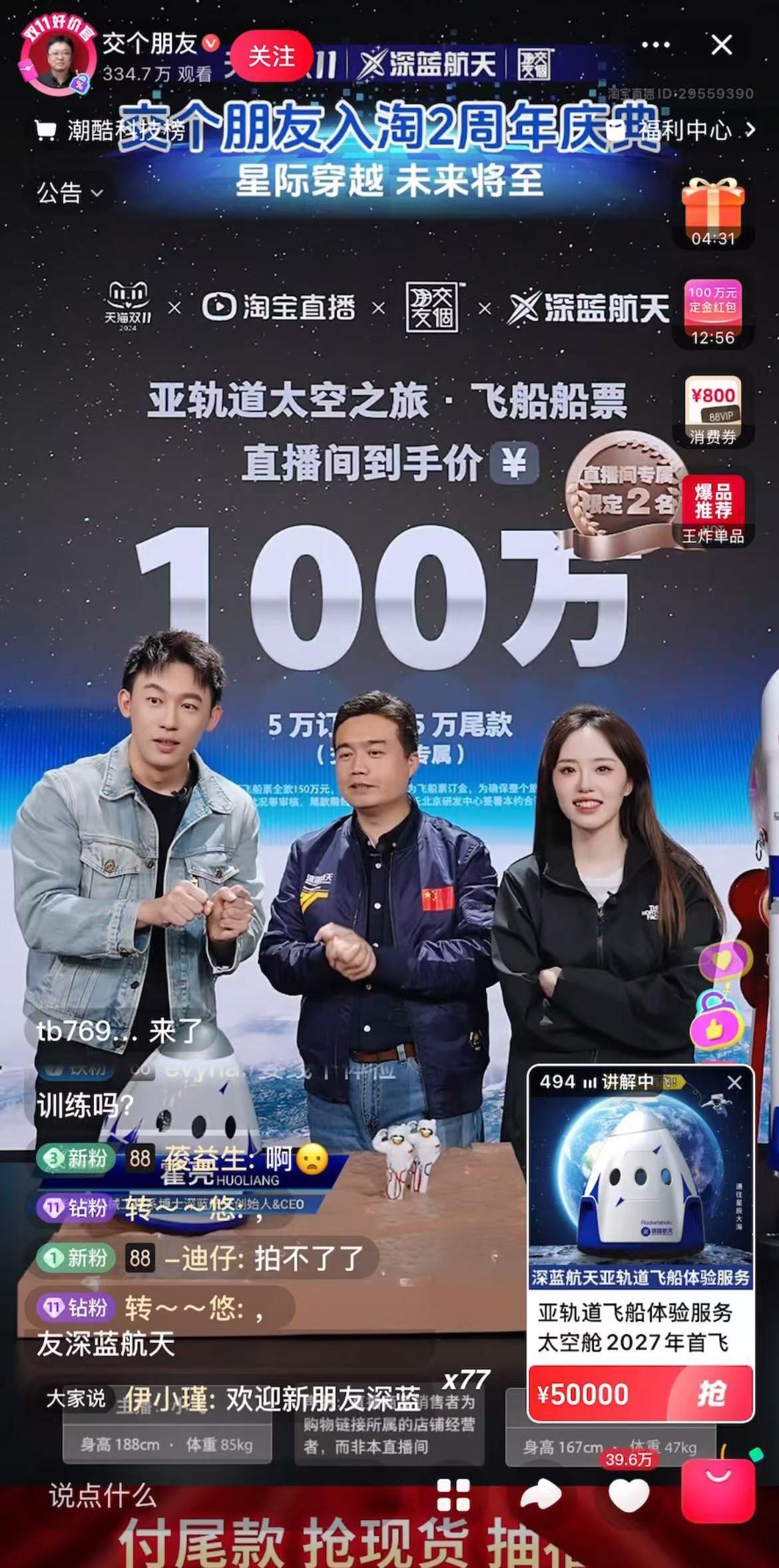 10月24日晚6点,深蓝航天CEO霍亮在淘宝交个朋友直播间介绍太空旅行项目,预售的商品为2027年亚轨道旅行的两个飞船座席,每张太空船票到手价100万元。预售商品上架后,霍亮尚未介绍完乘客所需满足的条件,船票就已售罄。