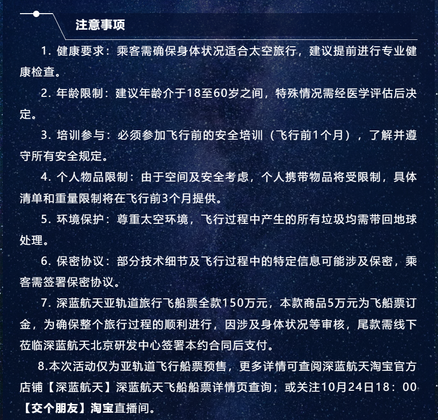 23日,公司公布的预售规则,深蓝航天亚轨道旅行飞船票全款150万元,商品5万元为飞船票订金。而在24日直播时,霍亮宣布,预售的5万元订金可抵扣50万元,到手价变为100万元。直播中,主持人特别提醒,为确保整个旅行过程的顺利进行,因乘客涉及身体状况审核,需线下莅临深蓝航天北京研发中心签署本约合同后支付尾款。