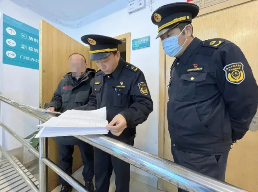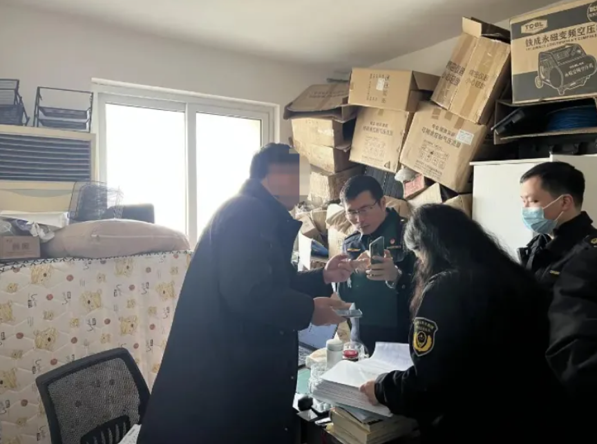 执法人员对当事人现场检查。