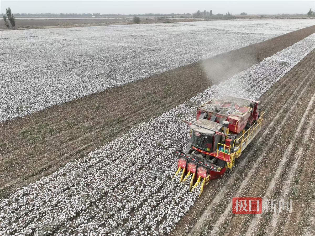 10月24日,在新疆阿克苏地区阿瓦提县,130万亩棉花已陆续进入采收期。记者在一块棉花地看到,大型采棉机在田地里穿梭,自上午11时到12时,十亩棉花地全部收割完毕,一小时前满眼星星点点的白色棉桃已被采摘、打包、装车。