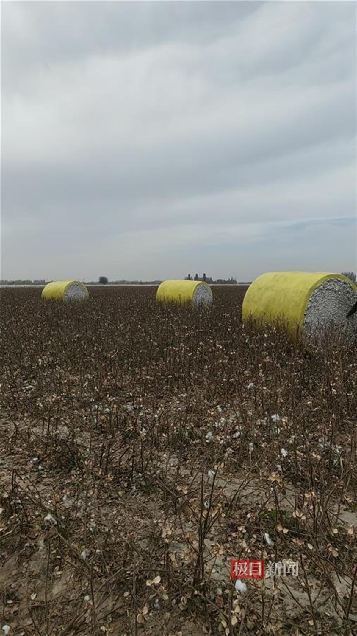 记者在采收现场看到,大型采棉机在田地里来回作业,不一会就“吃饱肚子”,下出一颗“金蛋”。“这些机器卷出来的棉蛋,平均重一吨,直径约1.65米。在集中装车后就会直接发去加工厂。”李海齐指着地里躺着的一颗颗“巨蛋”说道。