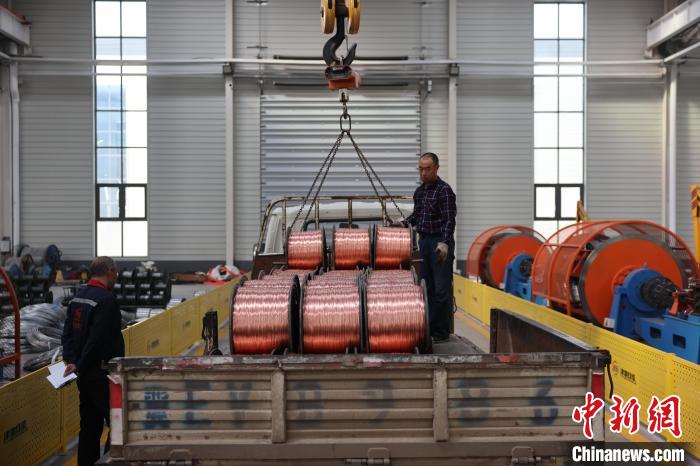 图为10月24日,宁晋县东汪镇一家电线电缆企业车间,工人正在搬运电缆铜芯。谷昭威摄