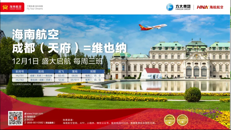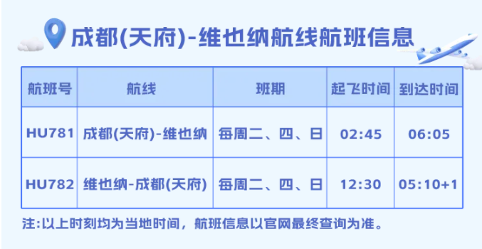 12月1日起,天府机场将开通成都=维也纳直飞客运定期航线,由海南航空执飞,计划每周3班,班期为每周2、4、7,飞行时长仅需约10个小时。该航线开通后,成都至欧洲的直飞客运定期航线将达8条,为旅客往返中欧提供更多选择。