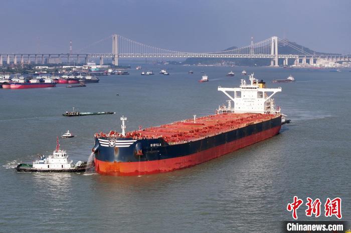 长江引航中心镇江引航站副站长曹金海介绍,“西比拉”轮船长299.95米,船宽50米,最大吃水12米,本航次从澳大利亚始发,在浙江舟山减载后,装载93000吨铁矿开往镇江港。