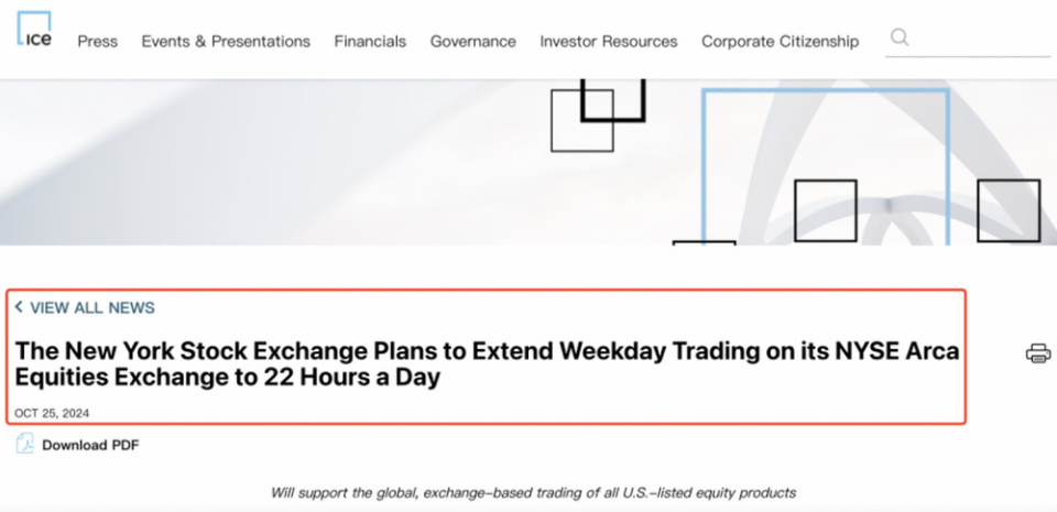 美东时间10月25日,美国纽约证券交易所宣布,计划将旗下全电子化交易所NYSE Arca的美股交易时间延长至每个工作日22个小时,待监管批准后实施。所有在美国上市的股票、ETF和封闭式交易基金都将适用这个最新的“22个小时”交易制度。