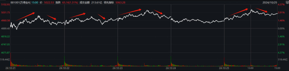 回过头看,本周5个交易日,大盘有4天都呈相似的冲高回落走势——上午震荡走高,午后分歧回落,尾盘小幅拉升;仅周四因明显缩量而偏弱。