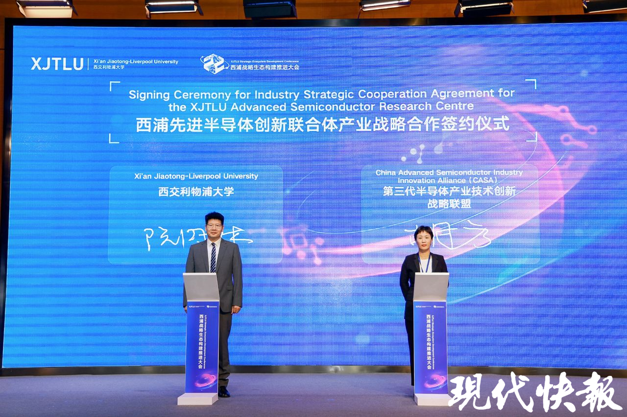 现场,西浦与国家第三代半导体技术创新中心(苏州)举行了西浦先进半导体创新联合体共建仪式,未来将开展“技术攻关-成果转化-产业孵化-产业培育”的全链条合作。北京大学理学部副主任、宽禁带半导体研究中心主任沈波教授被聘任为西浦先进半导体研究中心主任。西浦先进半导体创新联合体产业战略合作签约仪式也同步举行,首批签约单位包括第三代半导体产业技术创新战略联盟、华润微电子有限公司、嘉盛半导体(苏州)有限公司、苏州东微半导体股份有限公司、苏州敏芯微电子技术股份有限公司、苏州能讯高能半导体有限公司、上海溪赛德微电子有限公司等。