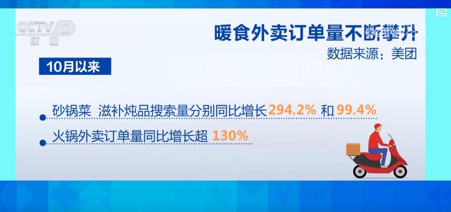 数据显示,10月以来,“暖食”的线上外卖订单不断攀升。砂锅菜、滋补炖品搜索量分别同比增长294.2%和99.4%,火锅的外卖订单量同比增长超130%。