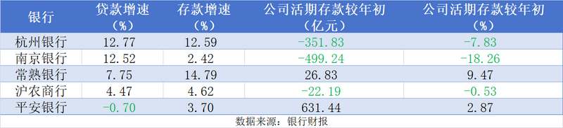 另从负债结构来看,在多重因素影响下,上半年部分银行对公存款大幅减少引发关注。从前三季度情况来看,这一趋势仍未明显改善,上述5家银行中有3家企业活期存款减少,分别是杭州银行、南京银行、沪农商行,其中存款失速的南京银行企业对公存款较年初减少了近500亿元,降幅超过18%。