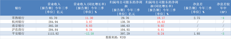 今年前三季度,平安银行营收增速延续上半年负增长趋势,降幅较中报略有收窄,但仍在12%以上。其余4家已披露财报的银行中,常熟银行营收同比增速超过10%继续领跑,但较上半年略有回落;南京银行营收同比增速超过8%,较上半年略高;杭州银行、沪农商行营收分别同比增长3.87%、0.34%。