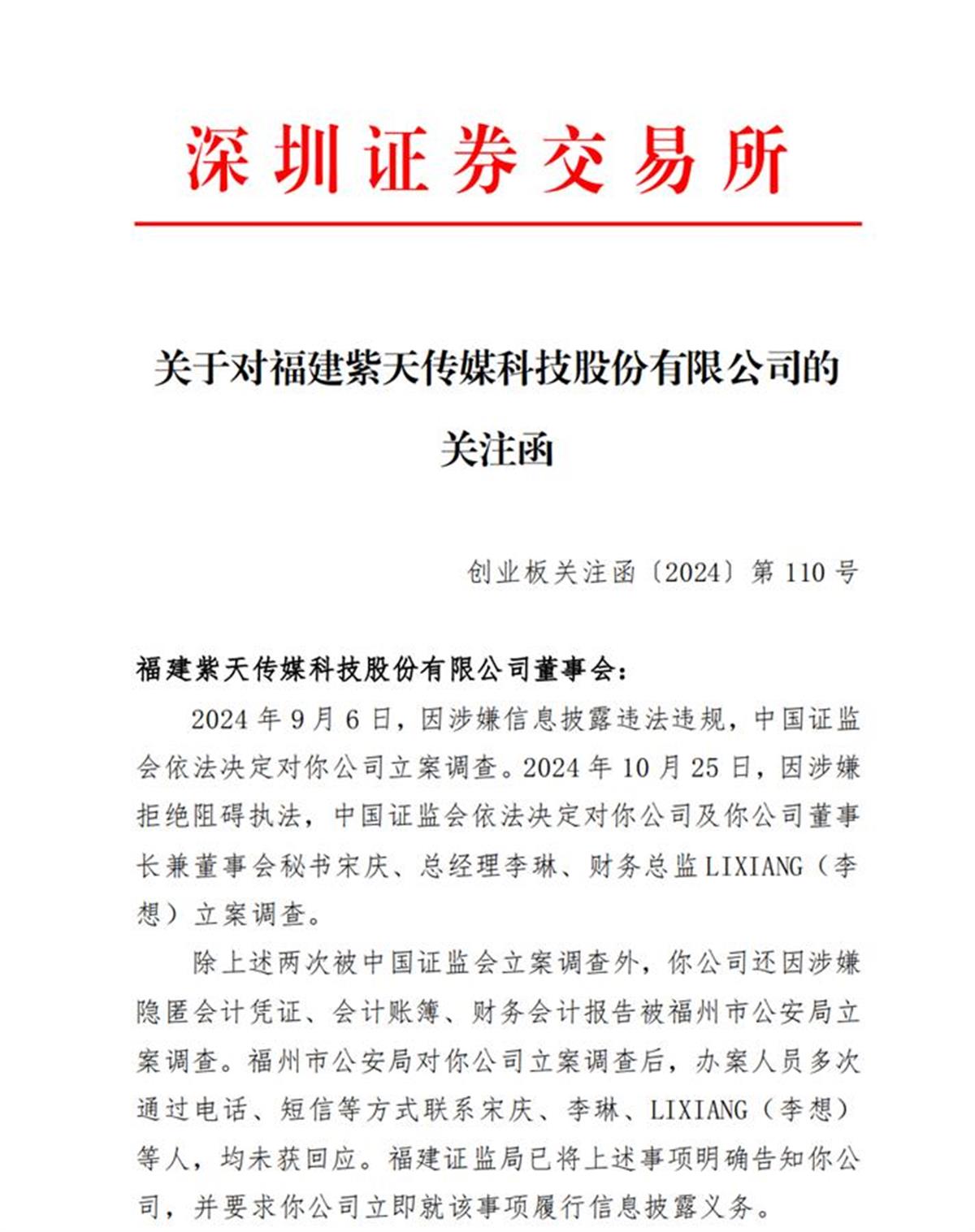 10月27日,深交所创业板公司管理部公布的《关注函》较为详细地呈现了事件经过:2024年9月6日,因涉嫌信息披露违法违规,中国证监会依法决定对紫天科技立案调查。10月25日,因涉嫌拒绝阻碍执法,中国证监会依法决定对该公司及公司董事长兼董事会秘书宋庆、总经理李琳、财务总监LIXIANG(李想)立案调查。