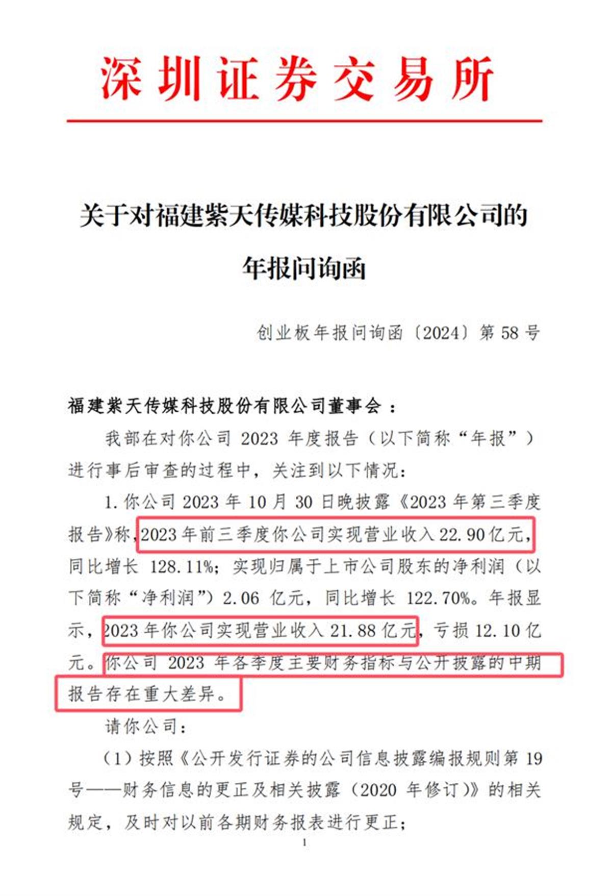 深交所在今年5月6日向紫天科技发送的《年报问询函》提到,2023年前三季度紫天科技实现营业收入22.90亿元,同比增长128.11%;实现归属于上市公司股东的净利润(以下简称“净利润”)2.06亿元,同比增长122.70%。但2023年年报却显示,2023年公司实现营业收入21.88亿元,亏损12.10亿元。深交所指出,该公司2023年各季度主要财务指标与公开披露的中期报告存在重大差异。有投资者追问,紫天科技为何会出现2023年全年营业收入比前三季度少的情况?