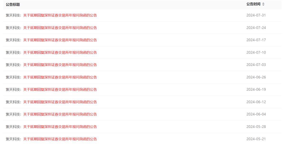 5月21日,紫天科技首次发布延期回复深交所问询函的公告。极目新闻记者注意到,紫天科技此后采取了“一拖再拖”的方式,前后一共延期了11次,至今未作出回复。令人惊讶的是,其最后一次延期回复年报问询函公告时,甚至忽略延期时间,称将视进展情况回复并披露。
