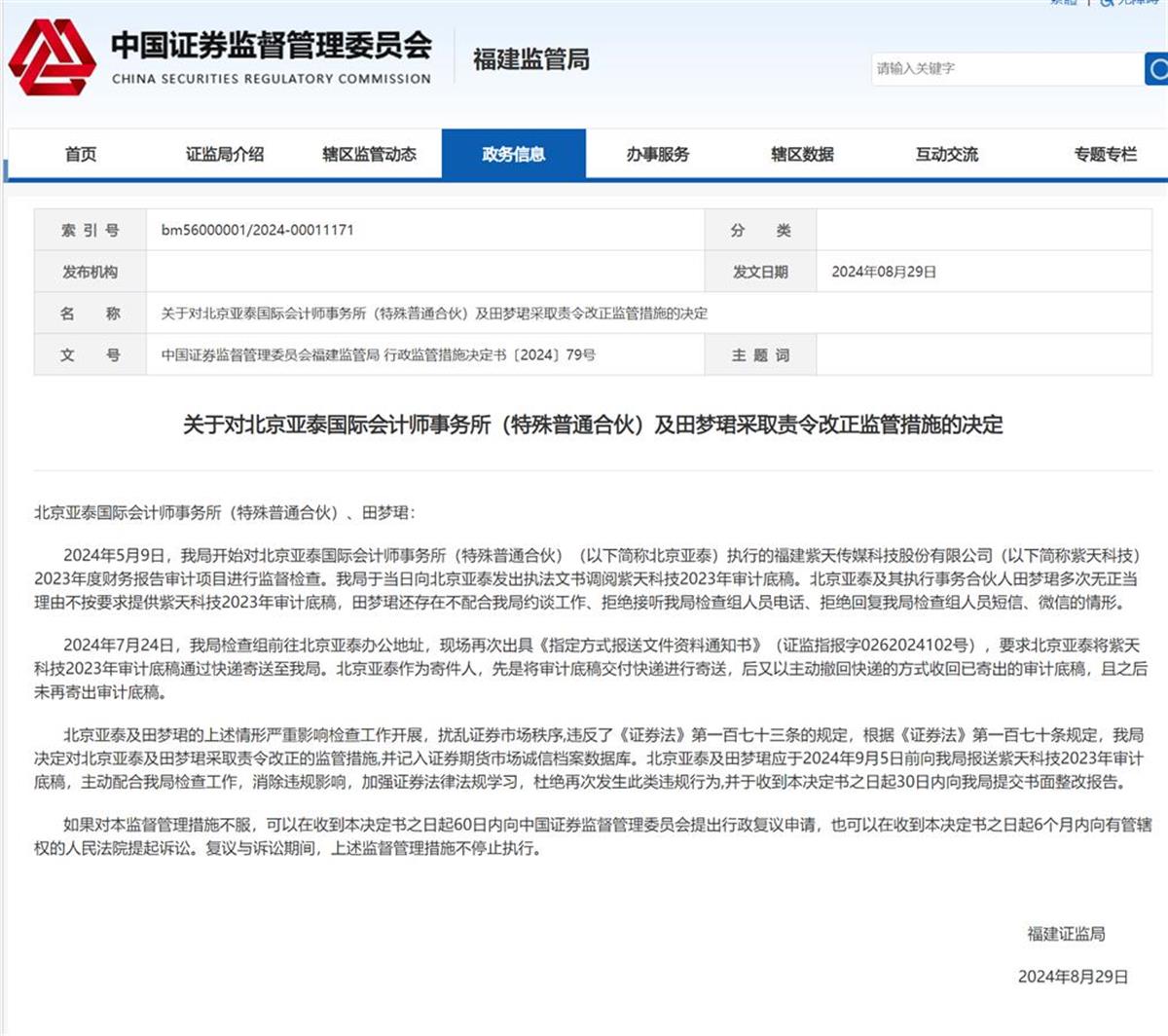福建证监局公布的行政监管措施决定书显示,今年5月9日,该局要求调阅紫天科技2023审计底稿,但亚泰国际及其执行事务合伙人田梦珺多次无正当理由不按要求提供紫天科技2023年审计底稿,田梦珺还存在不配合约谈工作、拒绝接听检查组人员电话、拒绝回复检查组人员短信、微信的情形。