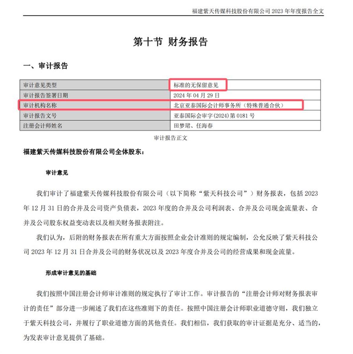 更令人迷惑的操作是,7月份,福建证监局要求寄送审计底稿时,亚泰国际先寄出,后又主动撤回快递,且之后再未寄出。也因此,福建证监局对亚泰国际及田梦珺采取责令改正的监管措施,并记入证券期货市场诚信档案数据库。极目新闻记者注意到,也正是这家审计机构在紫天科技2023年年报中出具了“标准的无保留意见”的审计报告。
