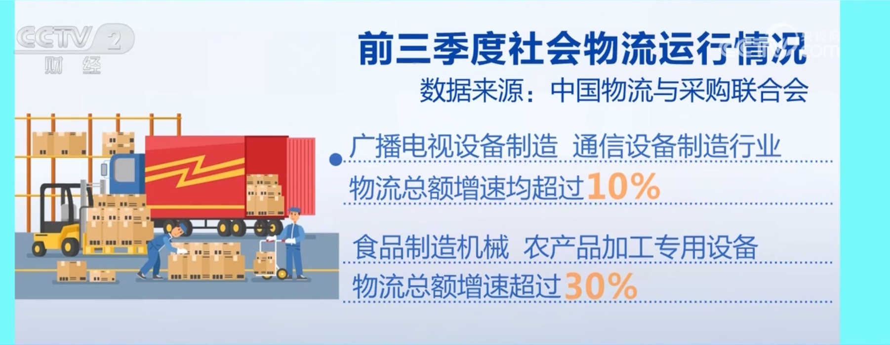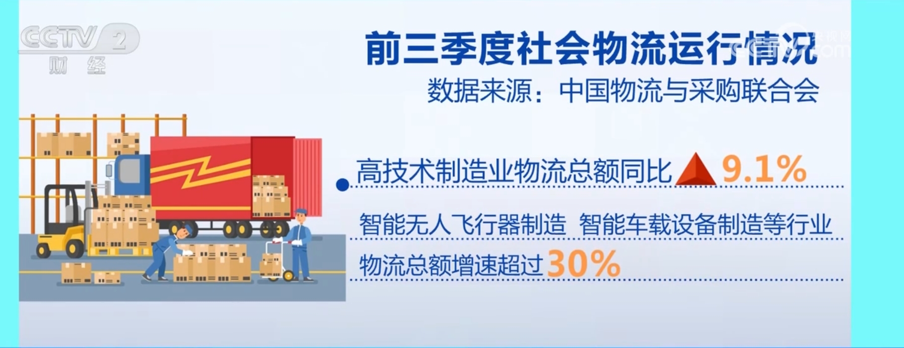 从生产领域看,前三季度工业品物流需求实现较快增长,全国工业品物流总额增长5.6%,超过92%的工业领域物流总额呈现增长。特别是新质生产力培育壮大。前三季度高技术制造业物流总额同比增长9.1%,其中智能无人飞行器制造、智能车载设备制造等行业物流总额增速超过30%。“两新”政策成效显现,前三季度消费领域以旧换新相关的广播电视设备制造、通信设备制造行业物流总额增速均超过10%,生产领域设备以旧换新相关的食品制造机械、农产品加工专用设备物流总额增速超过30%。从民生消费领域看,前三季度单位与居民物流总额同比增长7.6%,保持较快增长。此外,前三季度,社会物流总费用与GDP的比率为14.1%,较上半年下降0.1个百分点,比上年同期下降0.2个百分点。全社会物流成本稳中有降。