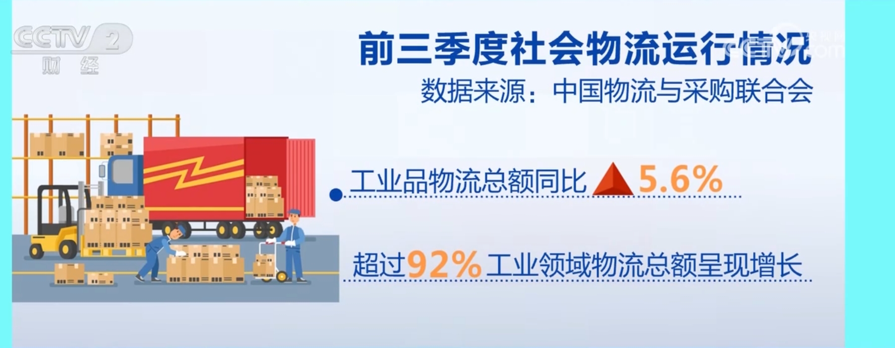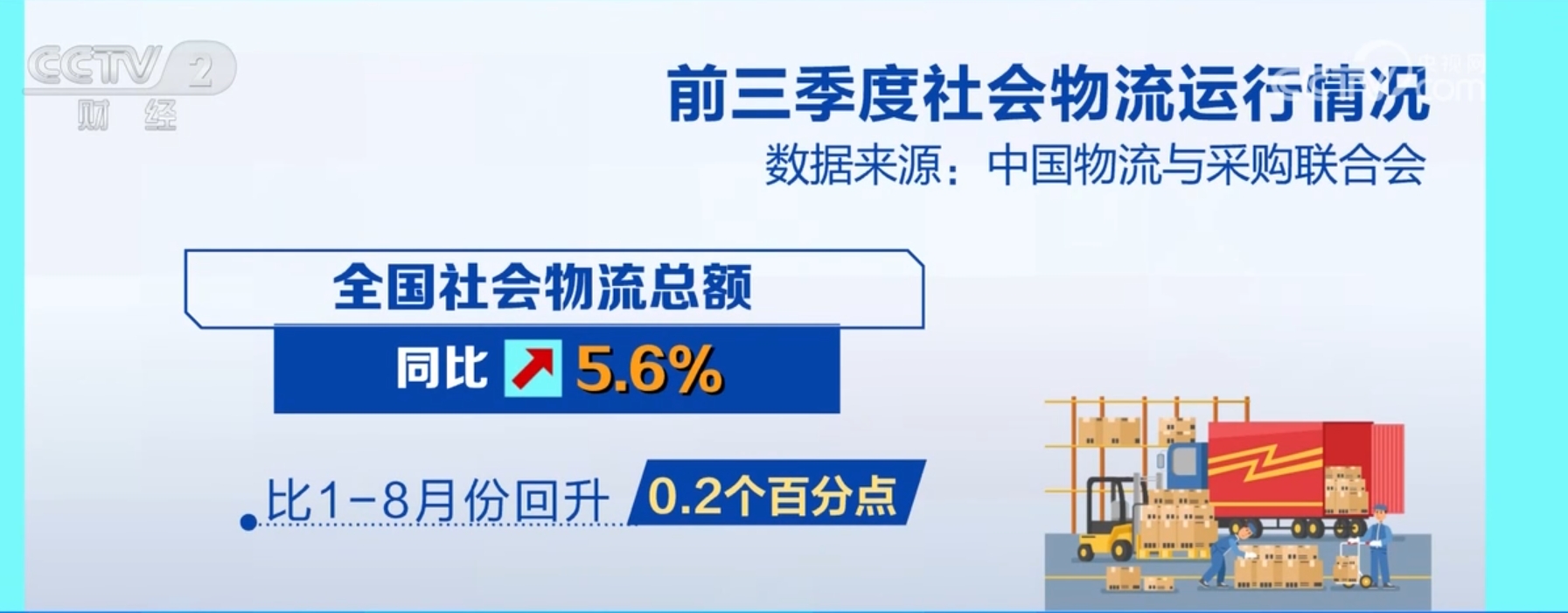 央视网消息:中国物流与采购联合会发布的最新数据显示,前三季度,全国社会物流总额258.2万亿元,同比增长5.6%,在存量与增量政策的协同作用下,物流运行延续企稳回升态势。