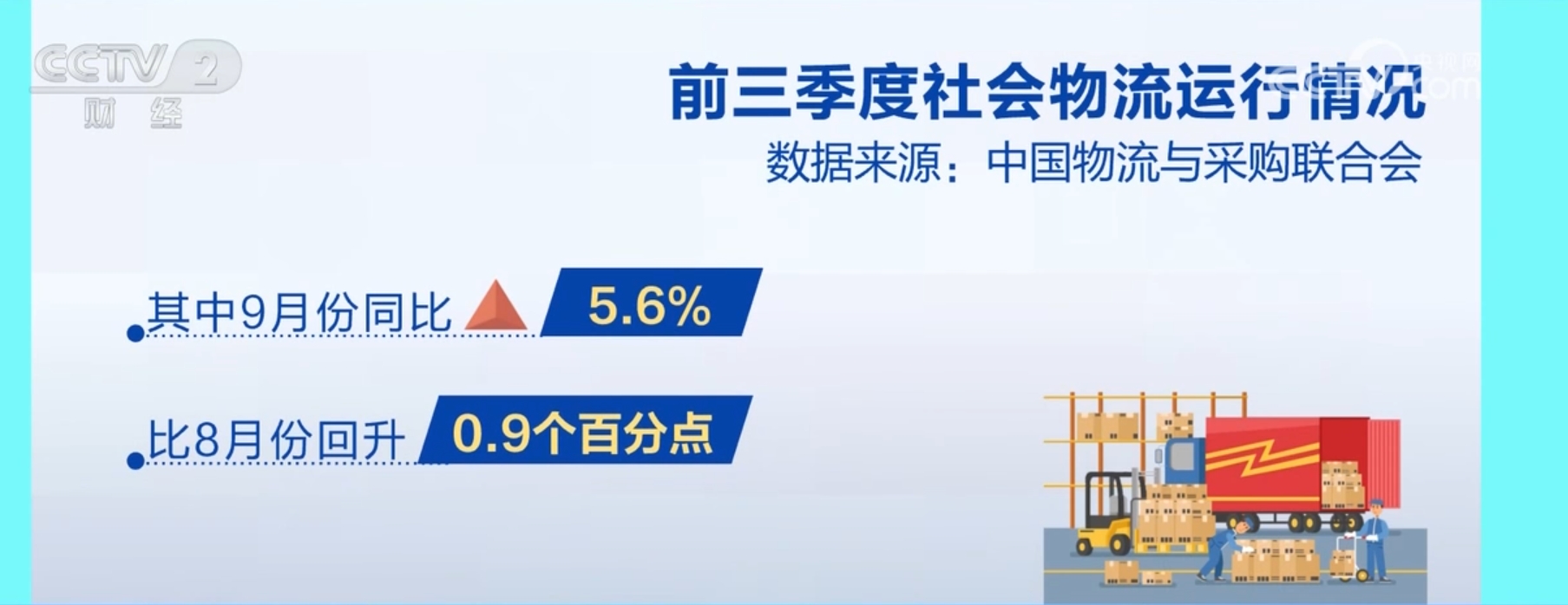 前三季度全国社会物流总额同比增长5.6%,比1—8月份回升0.2个百分点;其中9月份同比增长5.6%,比8月份回升0.9个百分点。物流需求出现较明显积极变化。