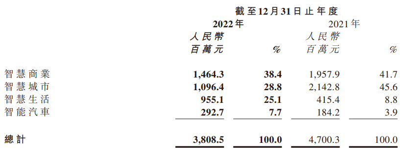 2022年及此前,商汤的业务主要分为智慧商业、智慧生活、智能汽车、智慧城市四大业务线。值得注意的是,近年来,该公司智慧城市业务营收出现明显下滑,与此同时,商汤积极推广生成式AI业务,业务结构进一步转型。