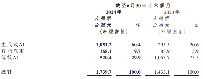2023年年报显示,在2023年的业务重组中,商汤科技明确了新的三大业务板块——生成式AI、传统AI和智能汽车,它们分别对应着提供生成式AI的模型训练、微调及推理服务业务,传统智慧城市、智慧商业与智慧生活的非生成式AI业务,以及原智能汽车业务。