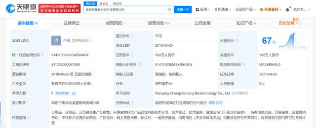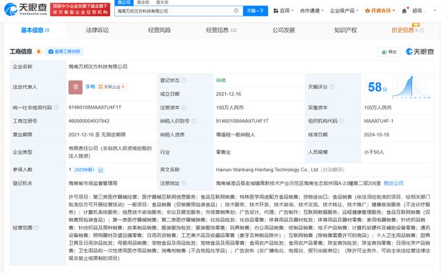 据报道,10月28日,打假人王海微博发文称,与辉同行带货的“万邦艾草贴”包装注明的“香港中科中药研究院”在香港并未注册,质疑产品涉嫌虚假宣传。记者根据万邦汉方官方旗舰店提供的证明文件查询发现,登记号码在香港登记公司名称为“香港天枢医药有限公司”,与客服提供信息中“香港中科中药研究院”名称不一致,但客服表示该公司与上述研究院“是一家”。天眼查App显示,香港天枢医药有限公司成立于2022年12月,登记号为74703052,企业状态为仍注册。“万邦艾草贴”生产厂家为南阳承善堂生物科技有限公司,该公司成立于2016年6月,法定代表人为卢斌,注册资本500万人民币,经营范围含日用品、艾制品、艾灸器具生产及销售等,由卢斌全资持股。风险信息显示,2020年9月,该公司因艾制品生产项目未经环保部门审批擅自投入建设,被南阳市宛城区环境保护局罚款1万元。知识产权信息显示,该公司已申请多个艾草加工相关专利。此外,“万邦艾草贴”总经销为海南万邦汉方科技有限公司,该公司成立于2021年12月,法定代表人为李梅,注册资本100万人民币,经营范围包括第三类医疗器械经营、货物进出口、互联网销售等,由复星医药旗下江苏万邦医药营销有限公司全资持股。