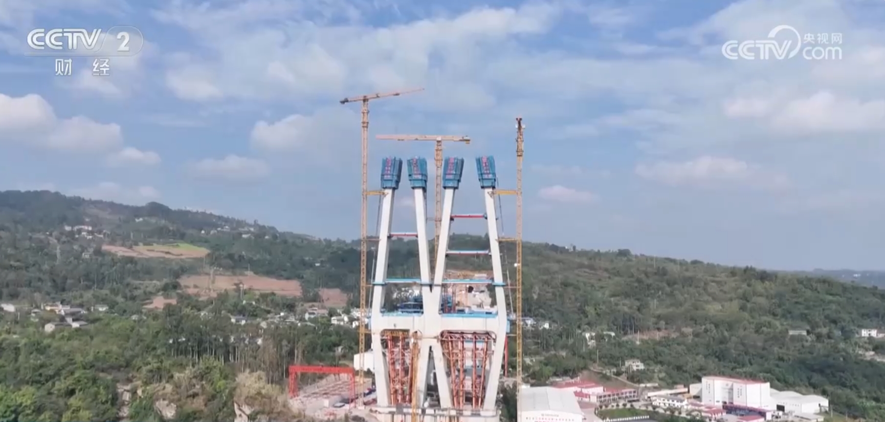 50公里外的长江岸边,渝万高铁控制性工程石沱长江大桥的主塔施工已经爬升到170多米的高空。受地形限制,这座公铁两用大桥创新采用公路和铁路同层布置的设计,还将建设世界最高的公铁双联塔。