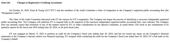 据悉,安永在辞职信中提到,“我们辞职的原因是由于近期获得的信息,使我们无法再依赖管理层和审计委员会的陈述,并且不愿与管理层准备的财务报表产生关联,经过考虑后我们认为无法继续根据适用法律或专业义务提供审计服务。”