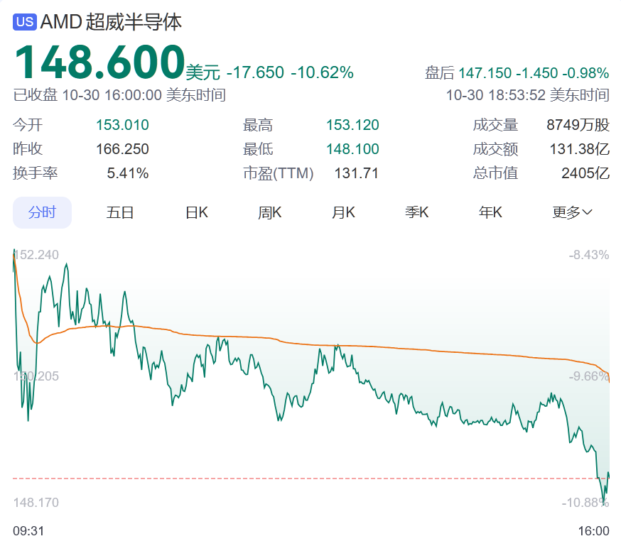 AI芯片巨头AMD的股价下跌超10%,因其第四季度收入指引未能令投资者满意。