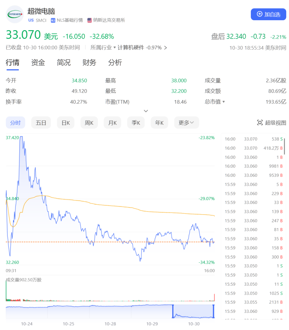 据证券时报,当地时间10月30日,超微电脑最新提交的SEC文件显示,由于安永对超微电脑诚信和道德的承诺表示担忧,已在审计期间辞职。超微在声明中补充说,该公司已开始物色新会计师事务所。受此消息影响,超微电脑股价一度暴跌超34%,截至收盘跌32.68%。
