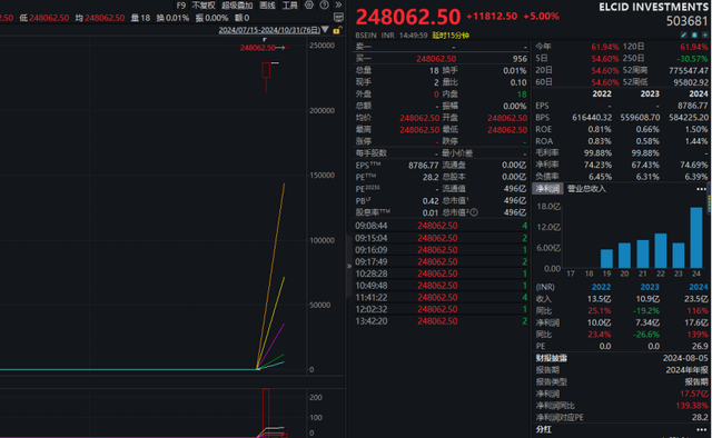 据券商中国,当地时间10月29日,印度一只名为Elcid Investments的小盘股大涨6692535%,隔天,该公司又上涨了5%,股价达到24.806万卢比,总市值接近500亿卢比。