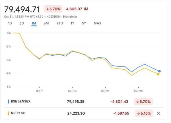 根据印度国家证券存管有限公司的数据显示,10月以来海外机构投资者净卖出了9093亿卢比(约合108亿美元)的印度股票,或为NSDL有数据统计以来最大月度净流出金额。
