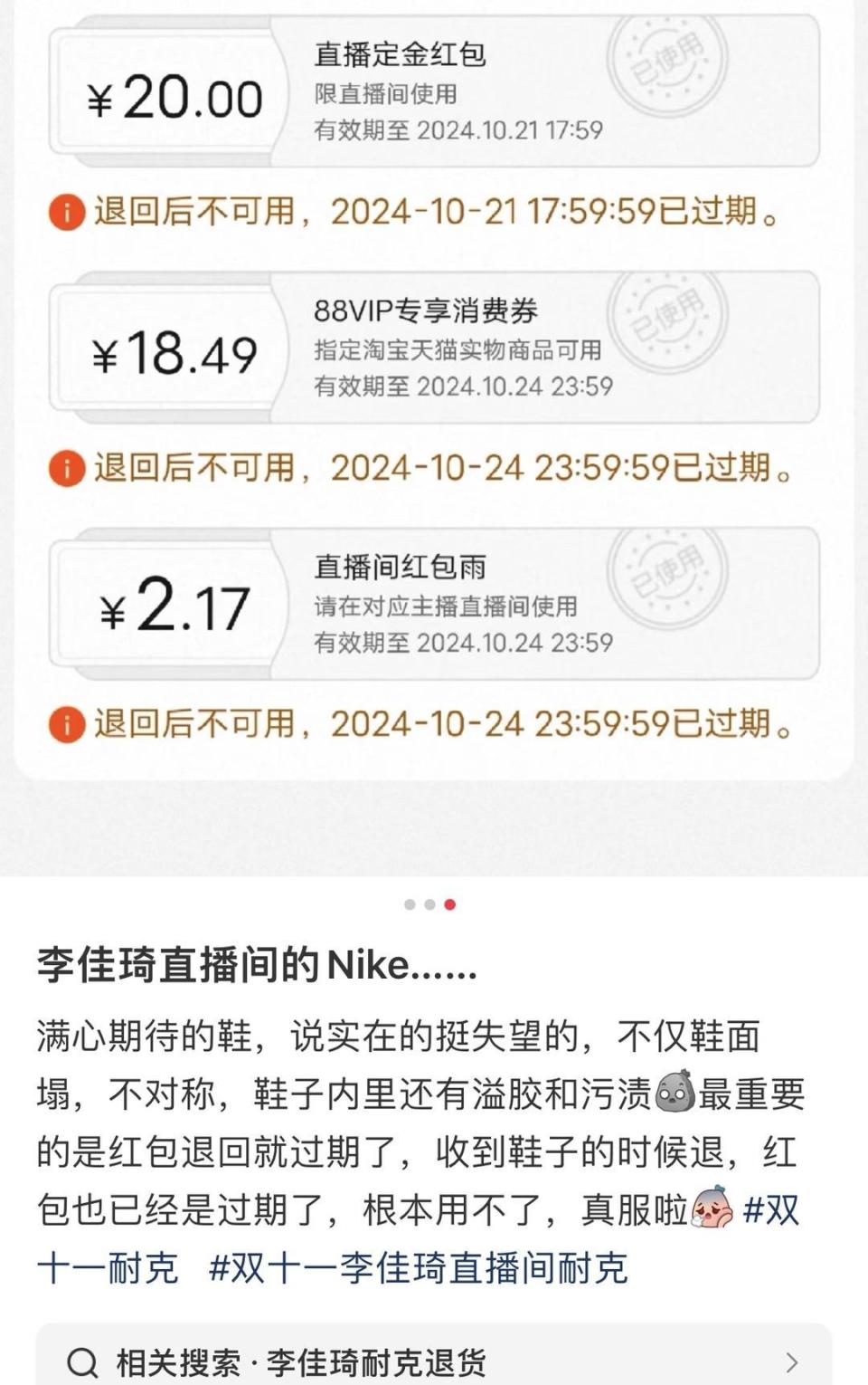 一名消费者向红星新闻介绍,近日,她购买耐克鞋时使用了李佳琦直播间抢到的上百元红包,到手后发现鞋子有上脚硬、脱胶等问题。耐克客服此前回复她,由于断码,目前只能退款不能换货,红包优惠券退回后也已经过期了,“这款鞋也已经下架了,相当于我们直播间那么多红包都浪费了。”也有消费者称,她到手的鞋子更为离谱,鞋舌一长一短,只能退货处理。不少消费者质疑,品牌是趁着双十一大促来处理瑕疵货。
