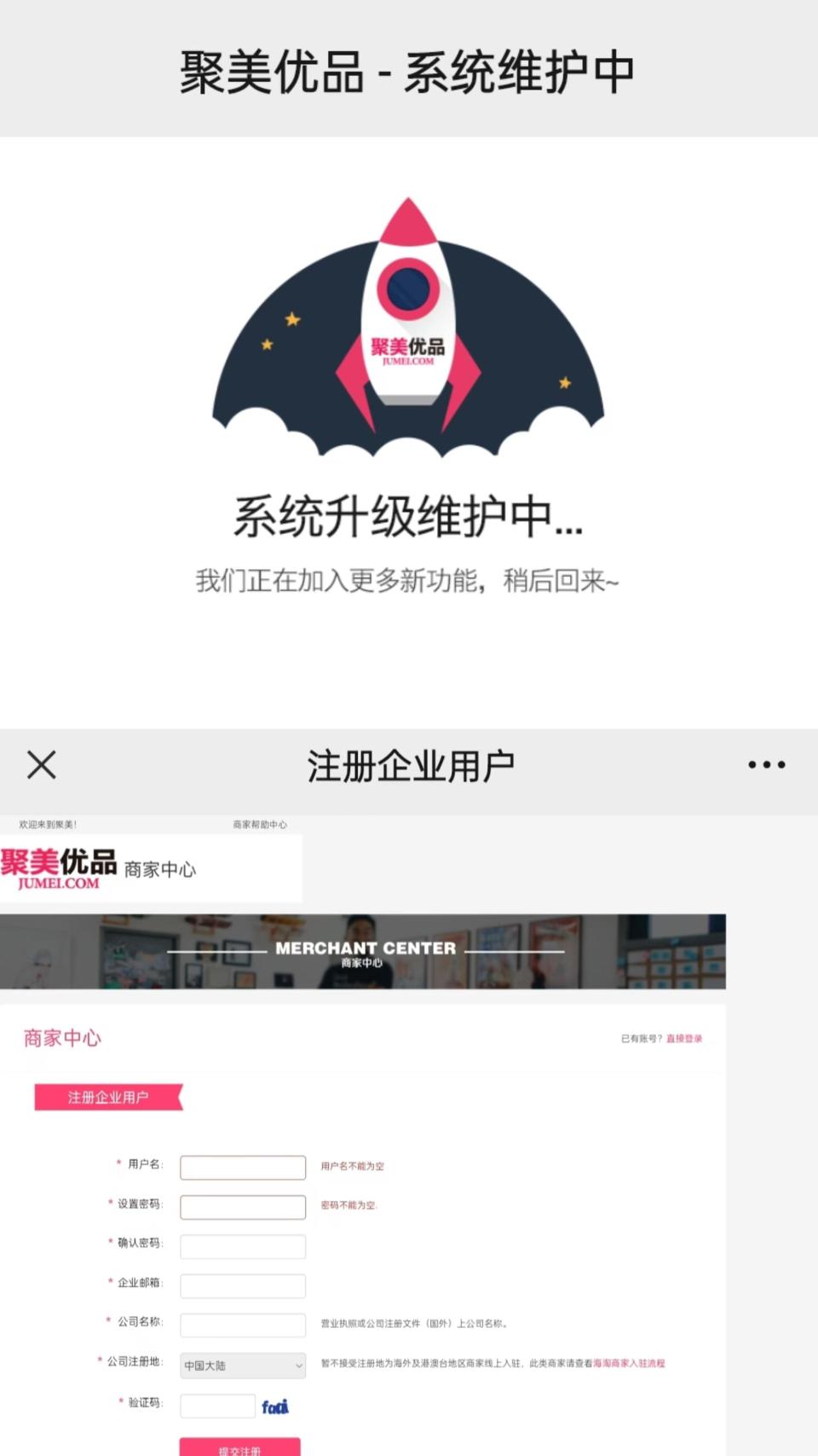 红星资本局注意到,目前聚美优品官网已经无法打开,页面显示“系统升级维护中”。不过,聚美优品商家中心网站还可以打开,商家可以在此网站提交注册申请。