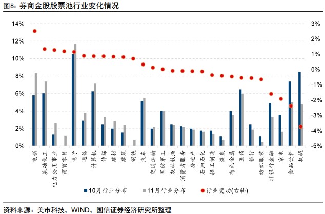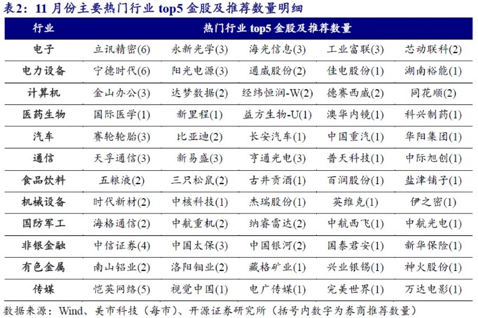 开源证券数据显示,相较今年10月份,11月券商金股增加最多的行业分别为电子、电力设备、计算机,增幅分别为3.2%、2.5%、1.7%。