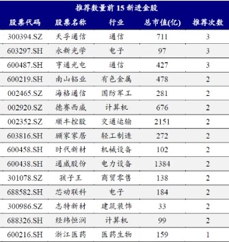 而在11月新进金股(相对2024年10月新进金股名单)中,天孚通信(300394)、永新光学(603297)、亨通光电(600487)等,合计均被推荐3次。