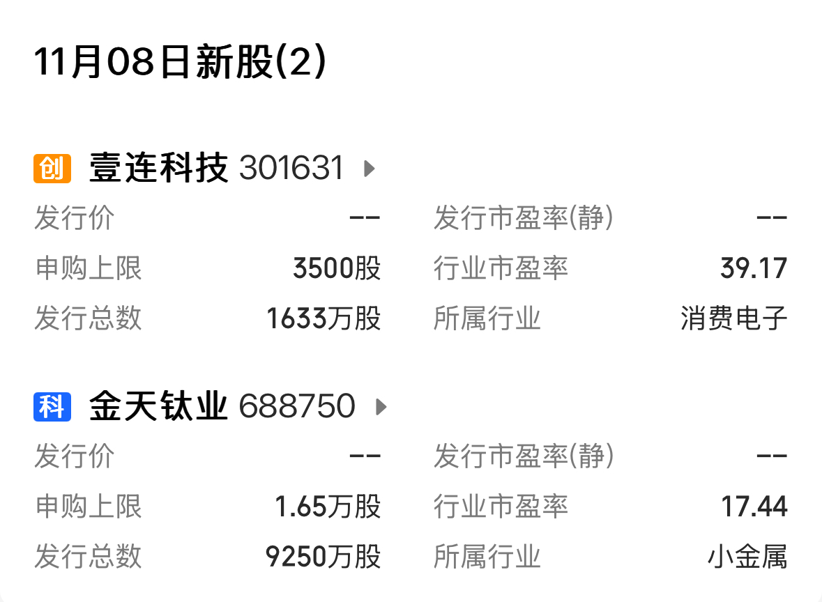 下周新股同样值得期待。截至记者发稿,目前A股已披露的新股申购名单中共有2只,分别为科创板的金天钛业和创业板的壹连科技,2只新股申购日期都为11月8日。