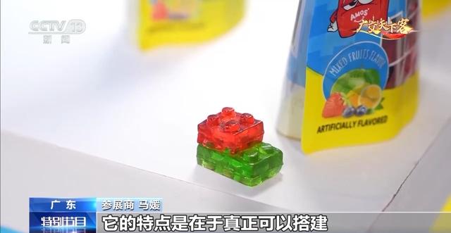 参展商 马媛:这个糖果屋是我们的积木软糖搭建的,它可以真正搭建。包装上有各种搭建的图案,可以搭建成各种动物和建筑。这是一个可以亲子互动,美味又好吃的产品。