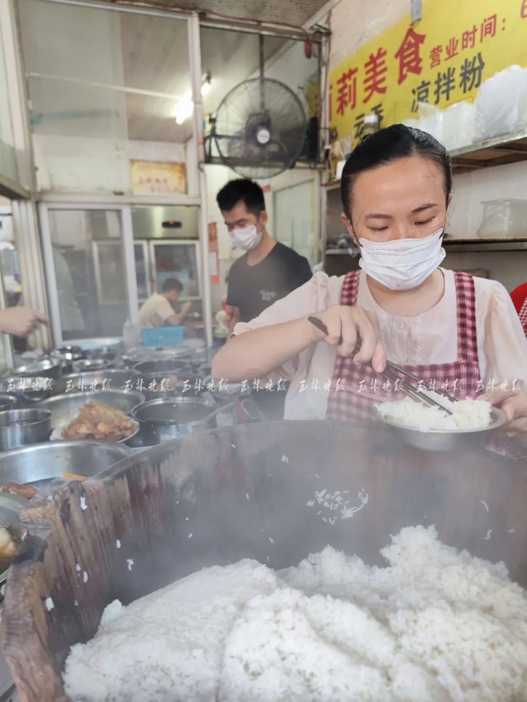 撒肉糯米饭的制作最耗时的是糯米饭的炊制。“一定要选用本地糯米,因为它比较软糯,也更适合本地人的口感。”梁莉介绍,制作前一晚就要将糯米淘洗好,并保证泡浸8小时左右;另外要选用玉林本地制作的木制炊具(玉林本土话叫“饭凳”)来炊制,这样炊出来的糯米饭才干爽、软糯、香气。
