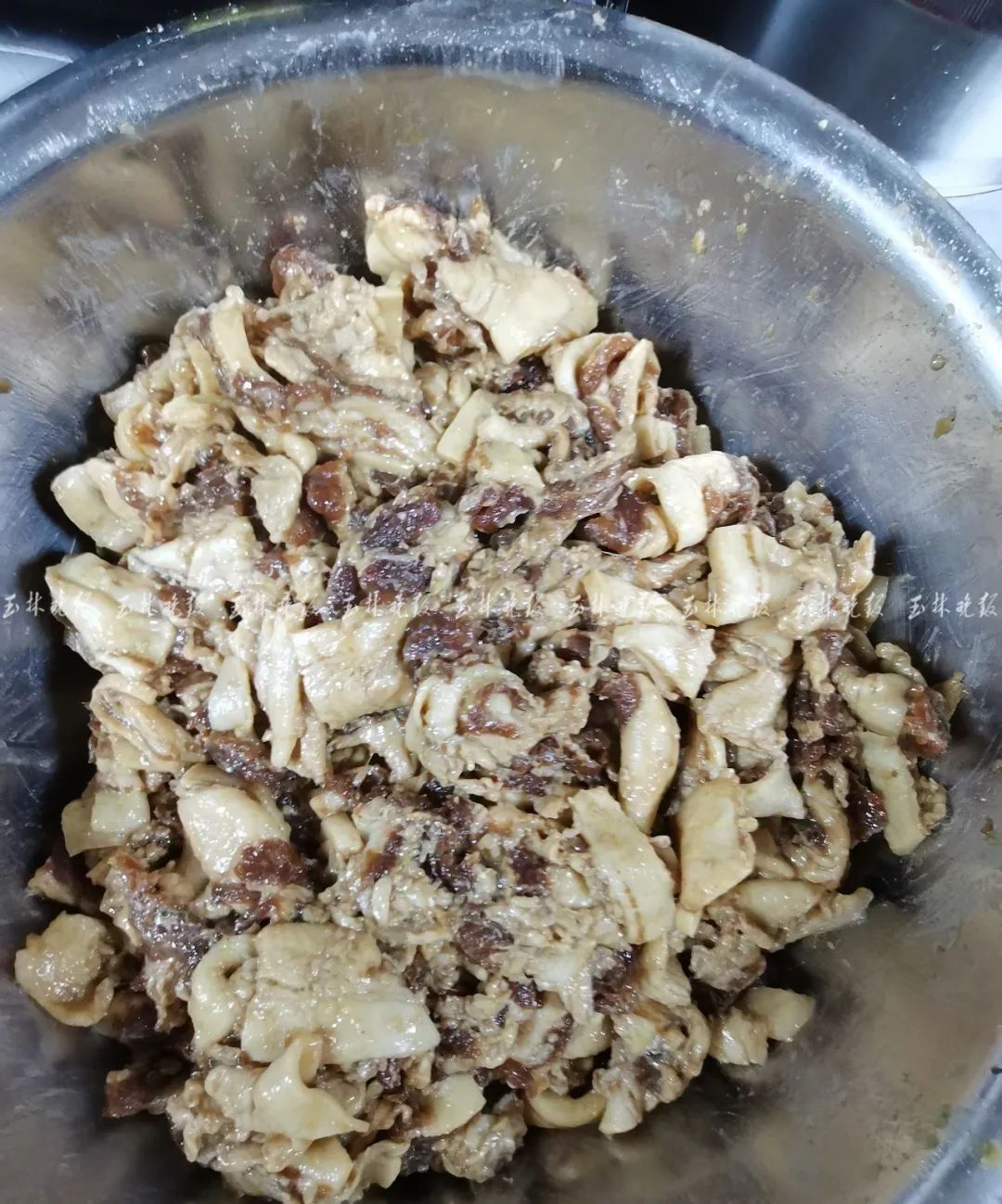 制作撒肉选用五花肉,并用白糖、姜汁酒、十三香等进行腌制。